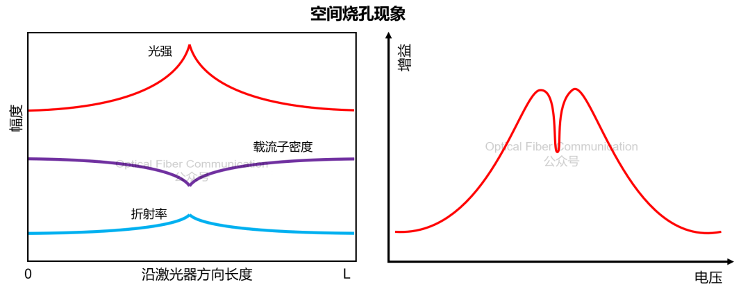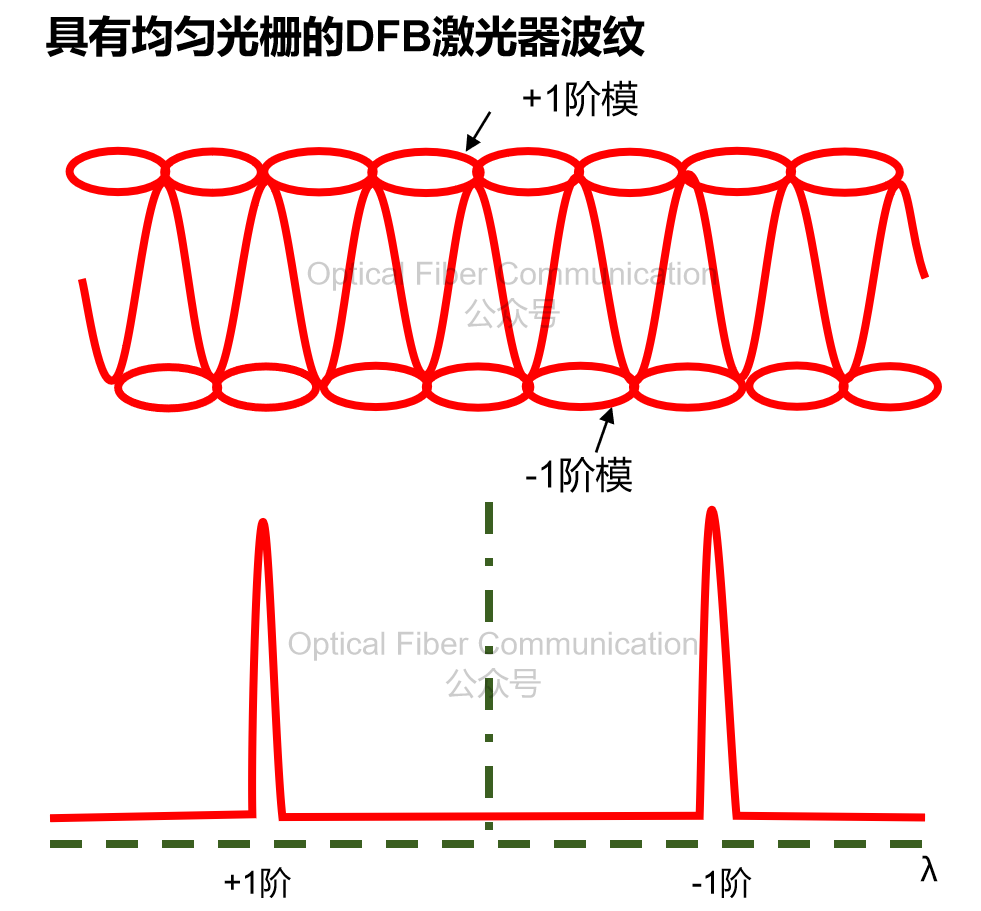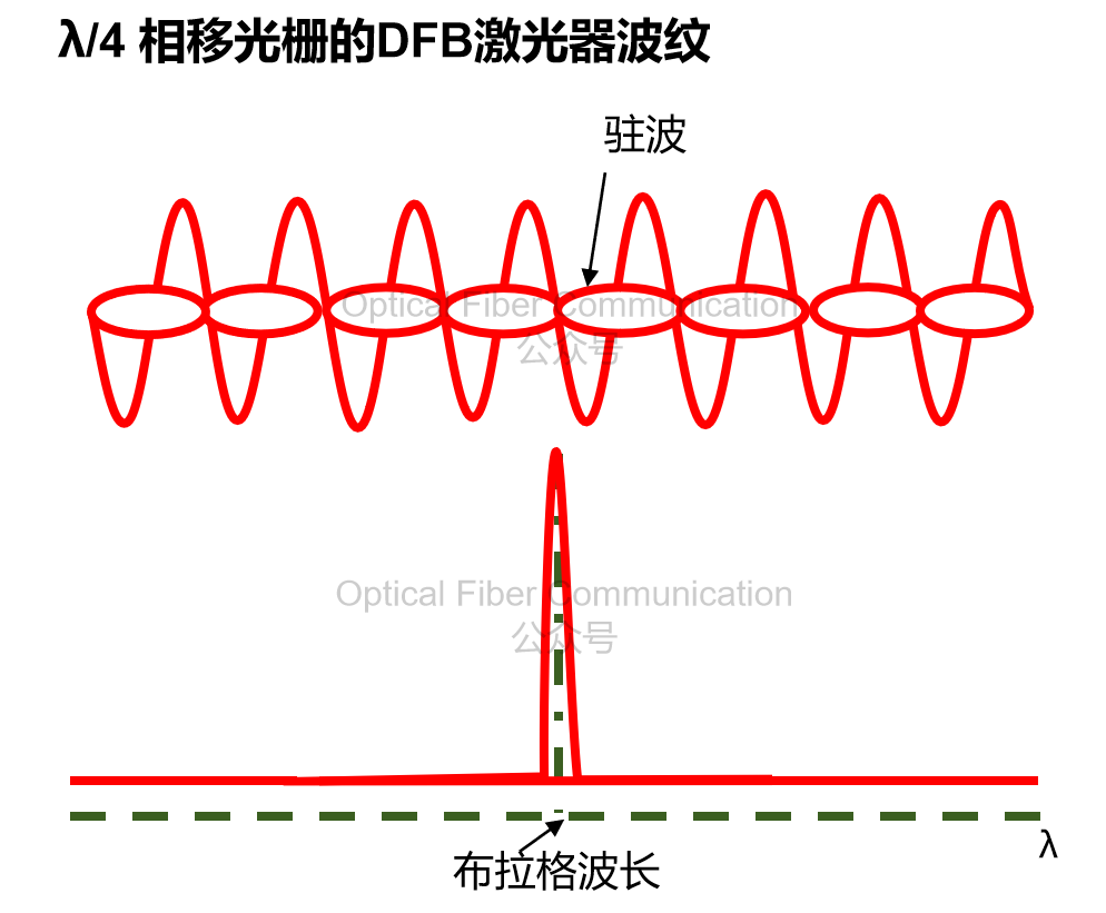 DFB 激光器的特点是在谐振腔内部实现对波长的选择性振荡。边模抑制比,DFB激光器的双峰。在均匀光栅 DFB 中,光栅会形成一个模阻止带。激光只能在阻止带两侧激发,产生一对对称的 +1 阶和 -1 阶模,它们的阈值增益完全相同。由于两个模式在腔内的光场分布不同,它们对应的等效折射率也有所差异,因此实际振荡的波长并不相同。为解决这一模式简并问题,一种常用且有效的方法是在均匀光栅的中间或特定位置,引入一个 1/4 波长的物理相位突变。对于这种引入 λ/4 相移的 DFB 激光器,位于腔中心的光栅波纹发生了相位反转,使得腔内仅能支持一个主驻波模式。该模式振荡在布拉格波长上,其波长值恰好处于均匀光栅DFB两个模式的中间。这样,在布拉格波长处便形成了阈值最低的模式,从而能够实现稳定的单纵模工作。不过,这种结构在高功率下仍可能出现跳模。功率升高时,腔内光强增强,光场在空间形成周期性分布。在光场最强的位置,载流子被快速消耗,产生局部载流子浓度的“空洞”,即空间烧孔(SHB:Spectral Hole Burning)。中心区域载流子浓度的下降会引起局部折射率升高,这将等效地改变原有的λ/4相移条件,从而导致高功率下的单模稳定性下降,激光线宽随之展宽。为缓解光场过度集中,可采用沿腔长渐变调制光栅周期的设计,使光场分布更均匀,即CPM DFB激光器。CPM DFB通过渐变周期引入分布式相移,显著减轻光场集中,提升高功率稳定性。224Gbps 单端驱动 EML 的 COC 封装方案三菱:从高台面结构到混合玻璃基板与 FC+WB 的高速 EML可添加微信OFC2025,邀请加入半导体&光器件产业链 2 群欢迎您加入我们的社群,获取大量半导体芯片/光器件/光模块领域的高价值技术文档、趋势研报!若您对半导体/光器件/光模块/光纤通信等感兴趣